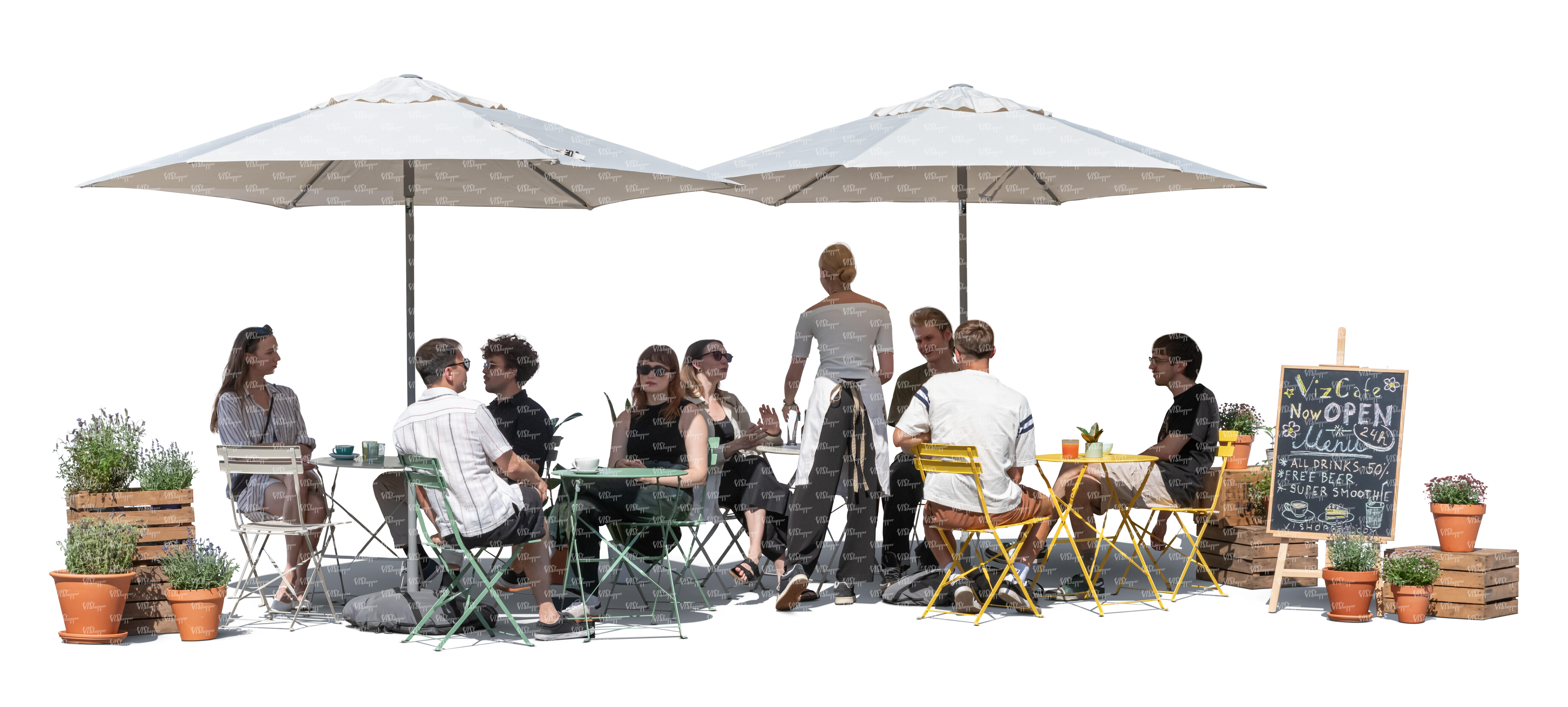 street cafe scene with parasols and people sitting and talking