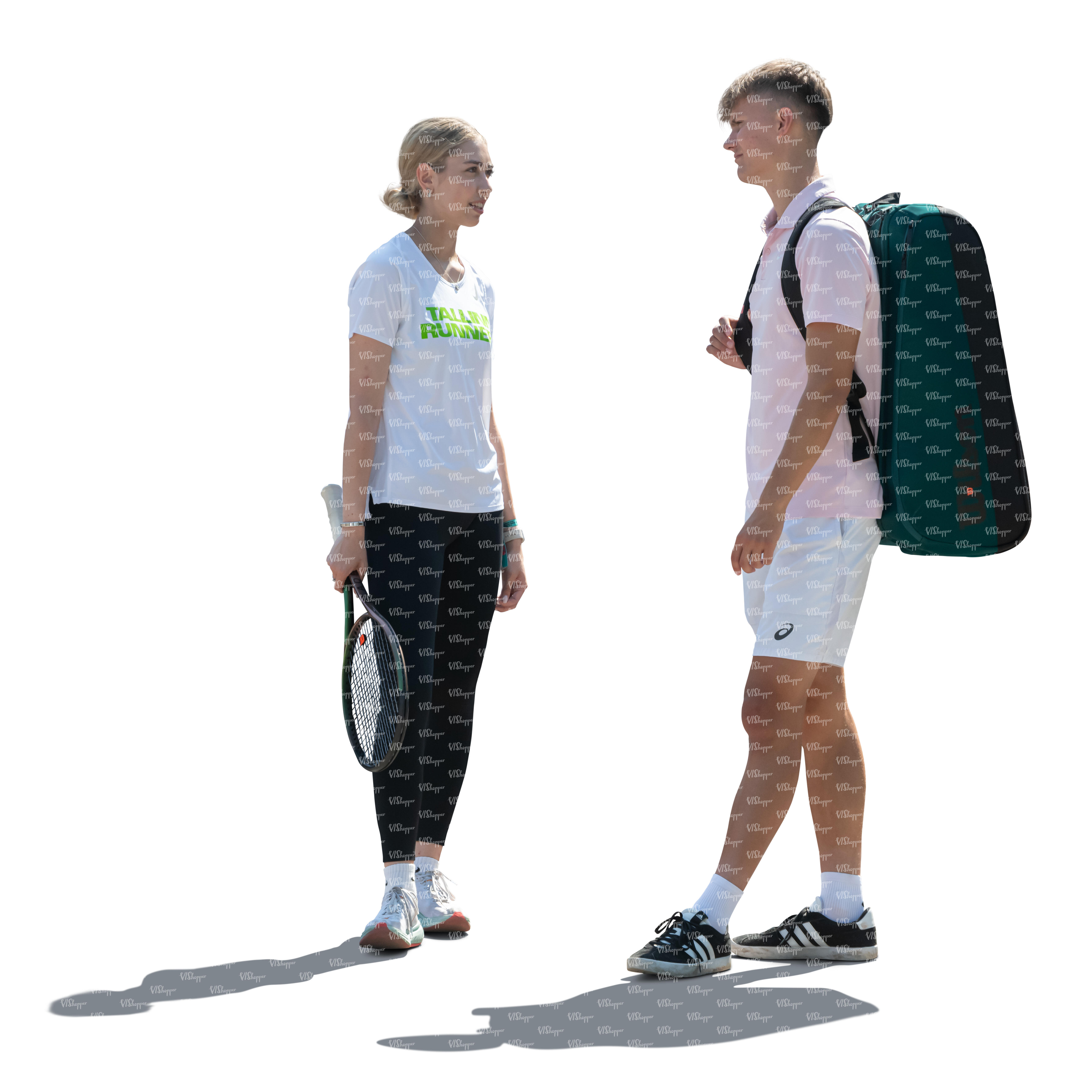 • cut out man and woman standing and talking while drinking refreshing drinks