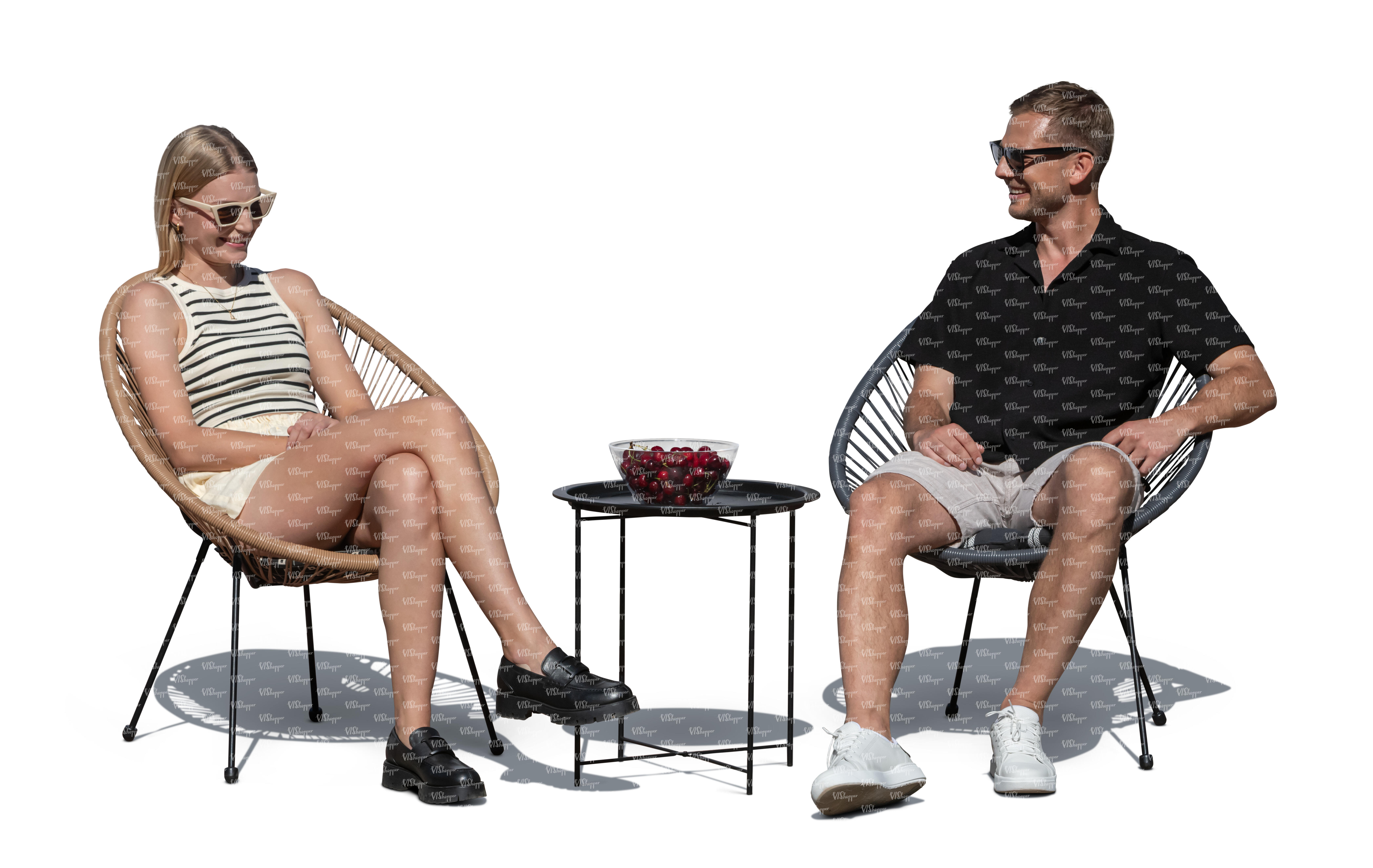 • cut out man and woman standing and talking while drinking refreshing drinks