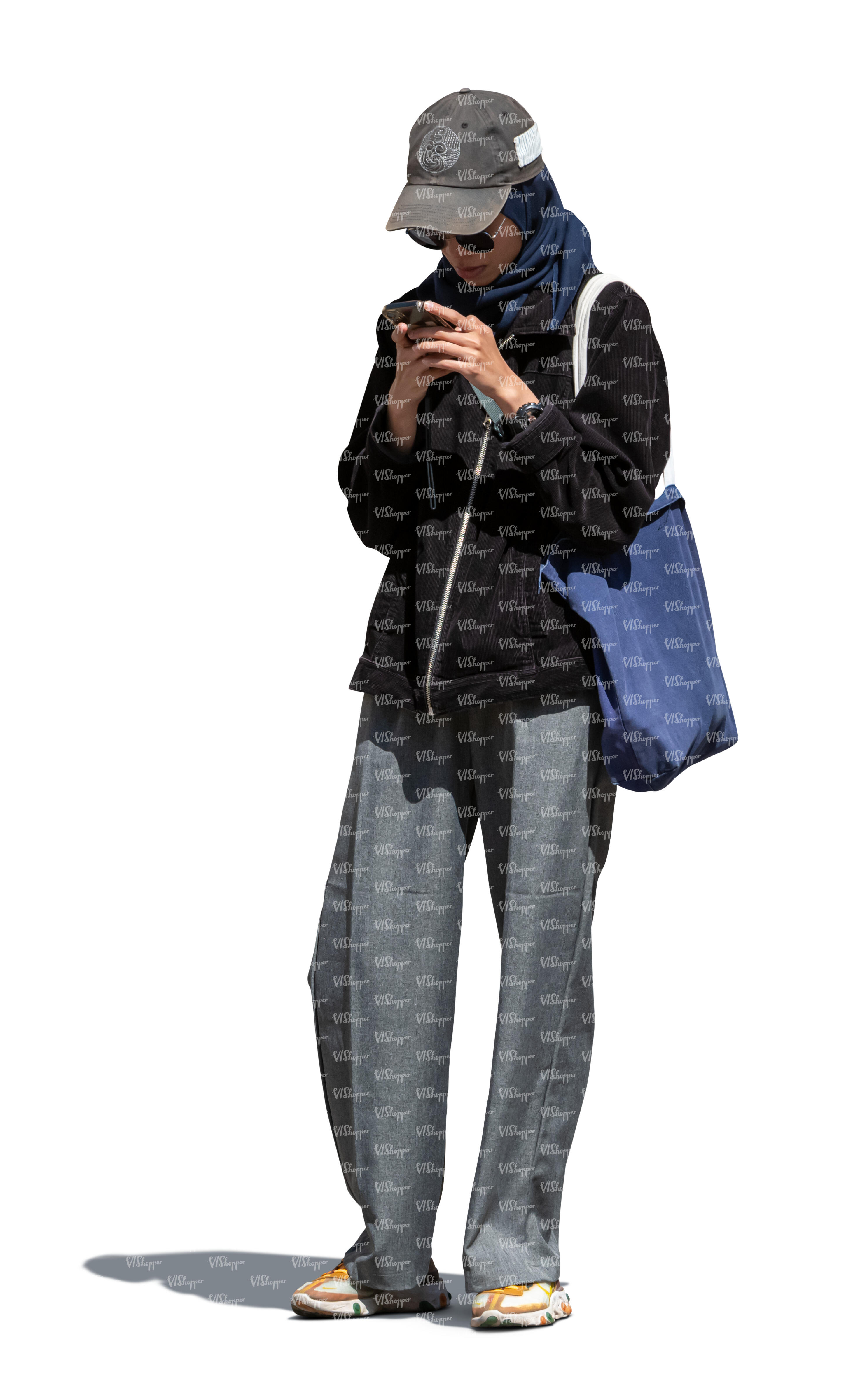 • cut out woman with a baseball hat looking at her phone
