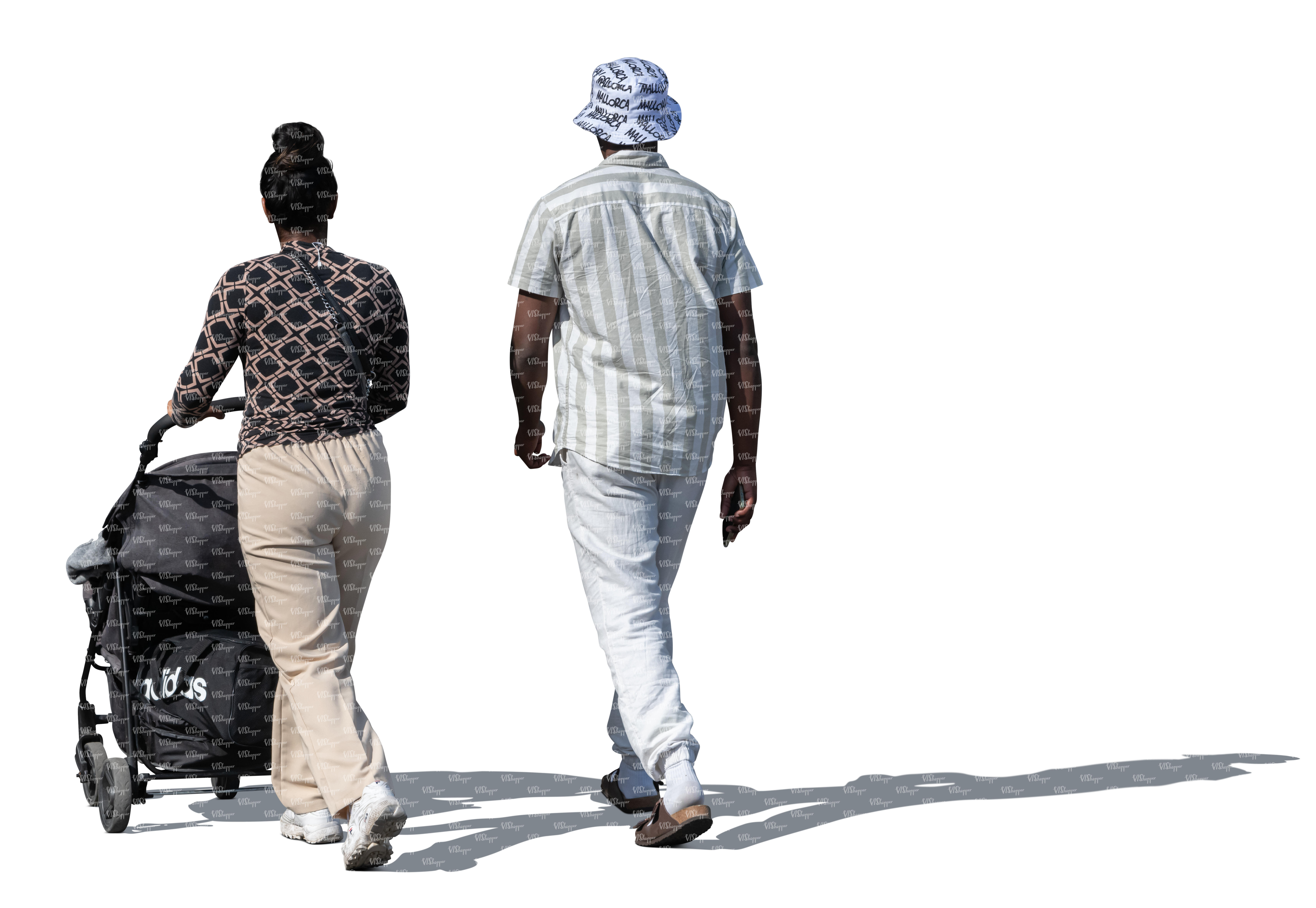 • man and woman with a baby stroller walking