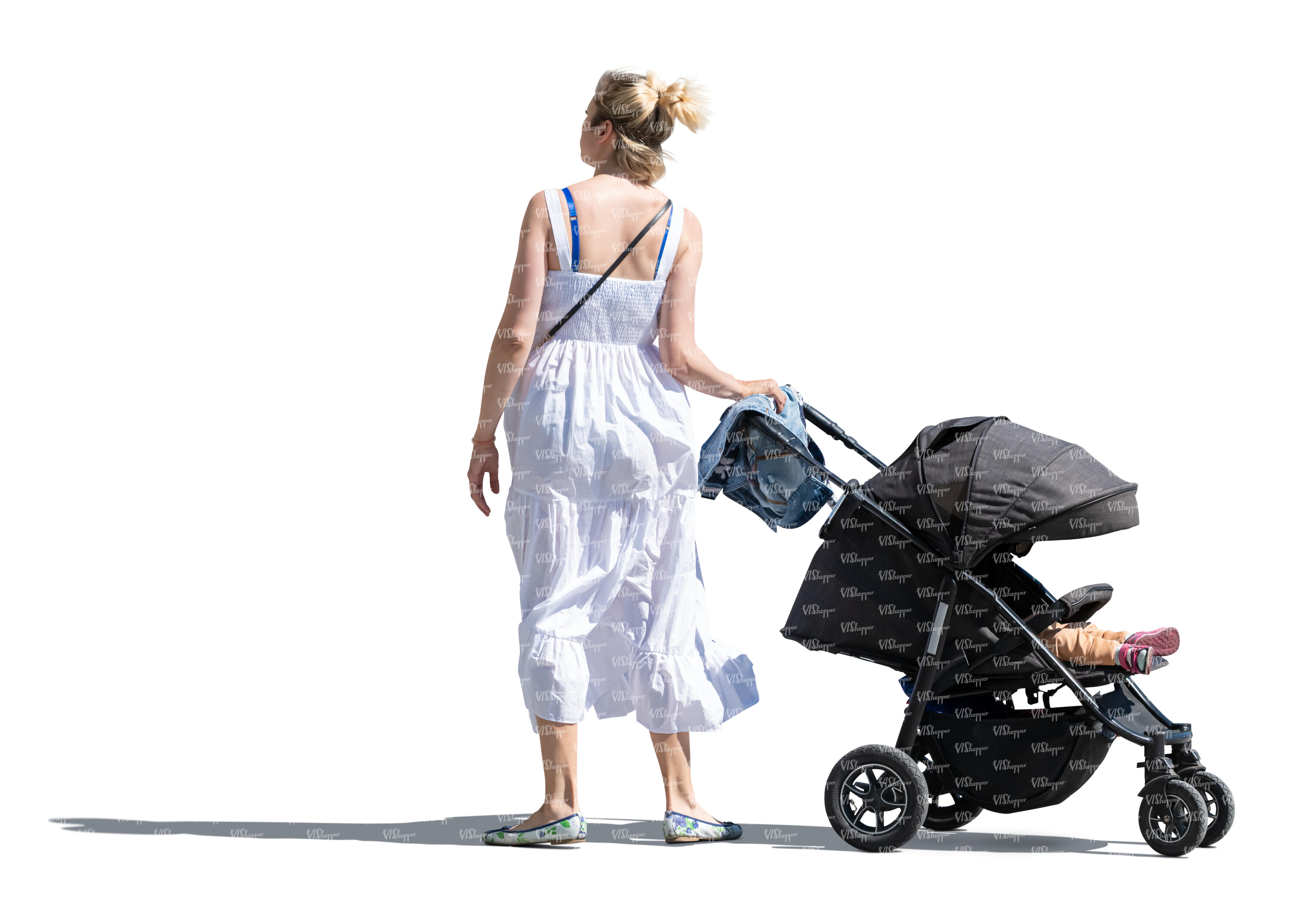 cut out woman in a white summer dress with a stroller standing