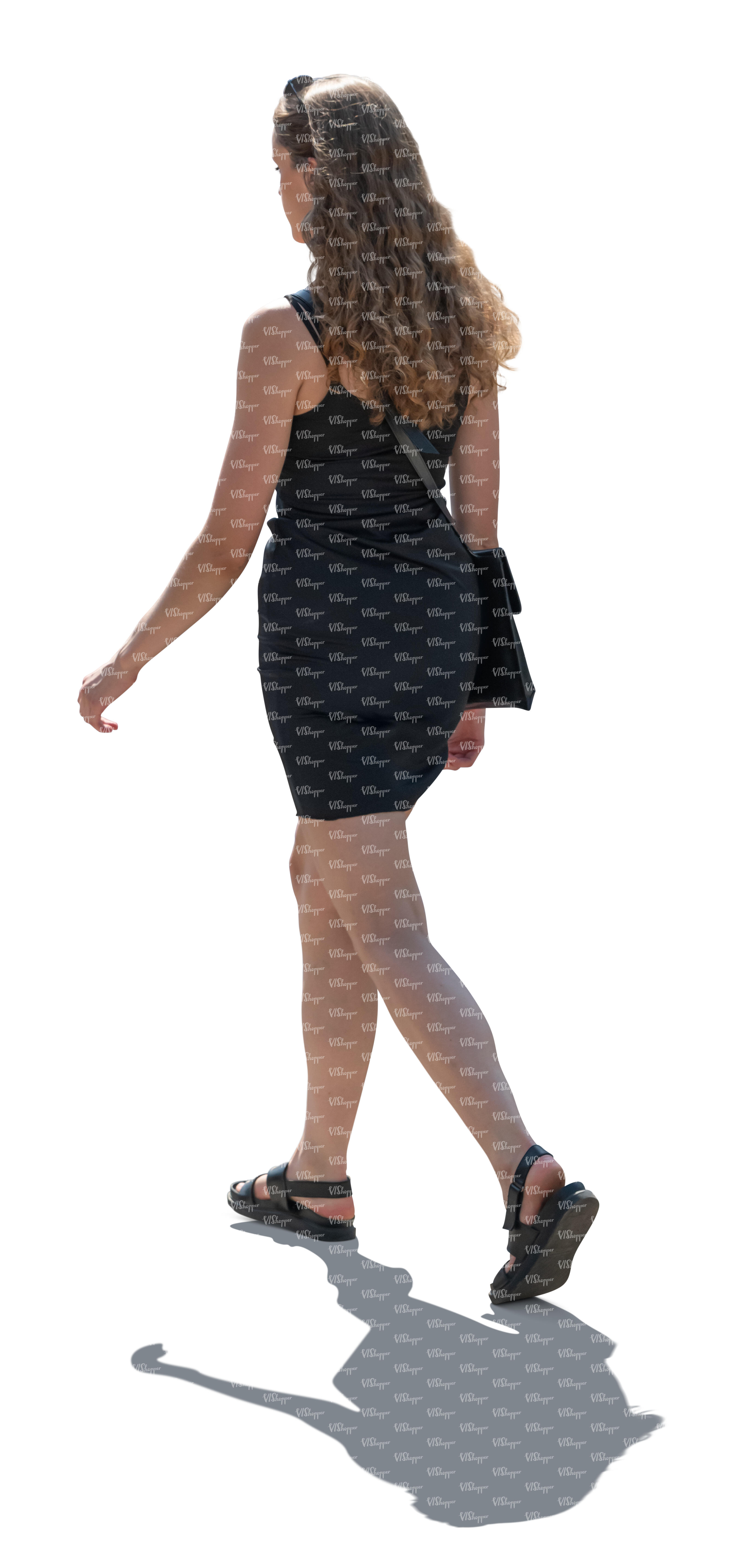 • backlit woman in a little black dress walking