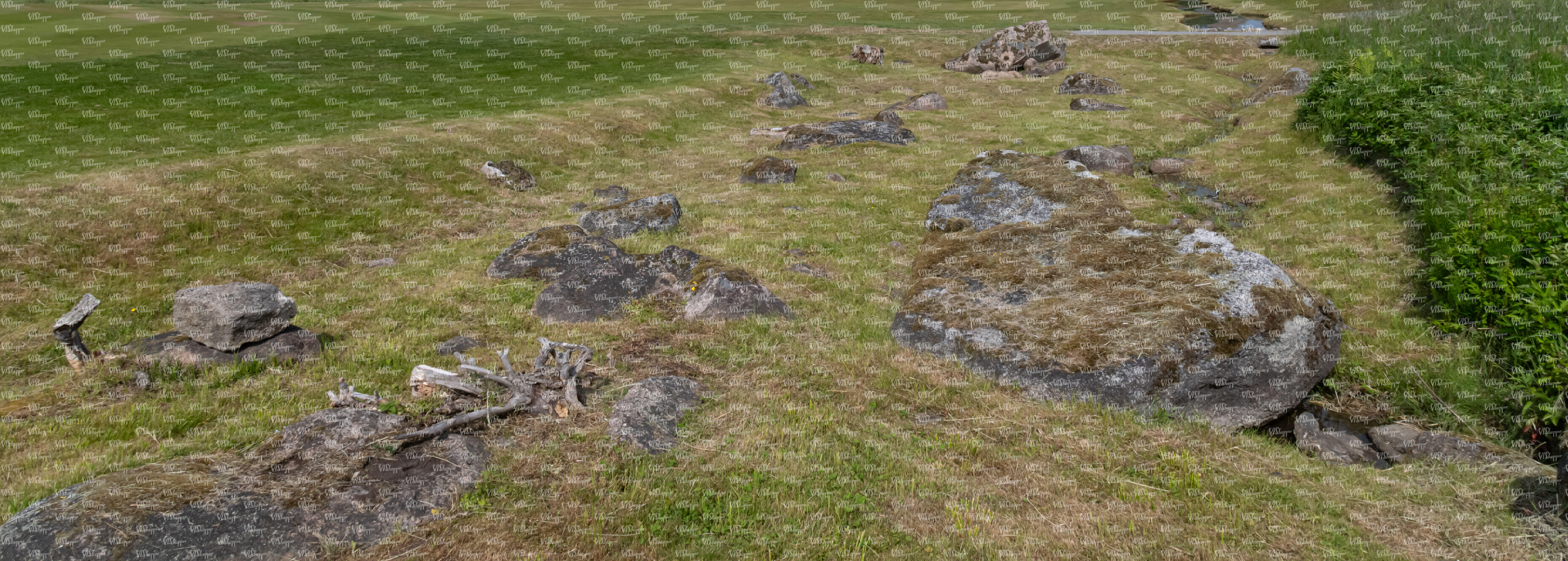 • grass field with rubble stones